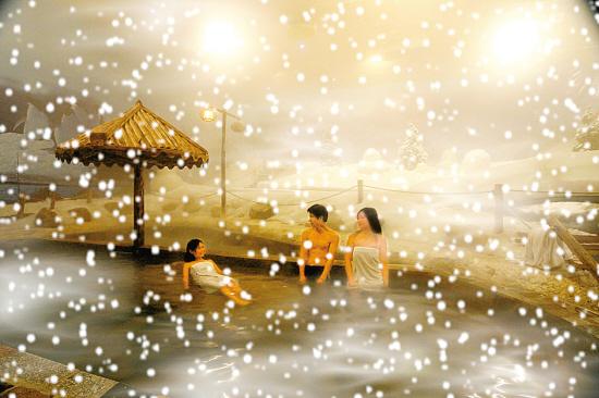 來到富都溫泉,你定要體驗一下亞洲獨創的“飄雪溫泉”.飄雪溫泉建在露天溫泉區,飄雪室內面積約1500平方米,冰雪與溫泉共生,寒冷與暖熱同在。抬頭仰望白雪皚皚的雪景,雪花從無極的天幕中飄灑下來,還沒等落地,就被蒸發的水汽蒸發彌漫。當你的身體浸泡在熱呼呼溫泉池里,可以感受到極冷與極熱的二重世界,是人生一大重要體驗。